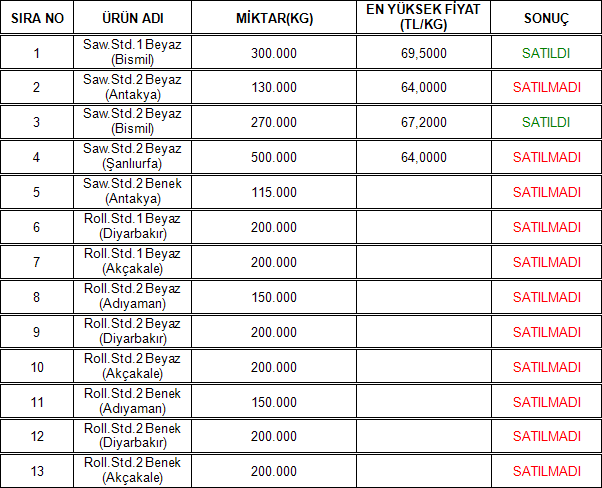 04.02.2026 tarihinde Adana Ticaret Borsamızın Elektronik Satış Salonu’nda gerçekleşen Çukobirlik ihalesinde aşağıdaki sonuçlar alınmıştır.