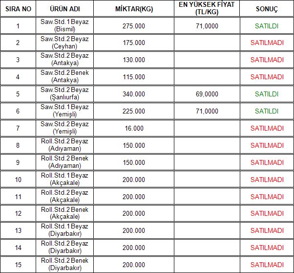 18.02.2026 tarihinde Adana Ticaret Borsamızın Elektronik Satış Salonu’nda gerçekleşen Çukobirlik ihalesinde aşağıdaki sonuçlar alınmıştır.