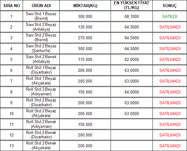 28.01.2026 tarihinde Adana Ticaret Borsamızın Elektronik Satış Salonu’nda gerçekleşen Çukobirlik ihalesinde aşağıdaki sonuçlar alınmıştır.