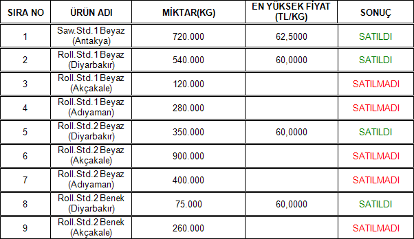 30.04.2025 tarihinde Adana Ticaret Borsamızın Elektronik Satış Salonu’nda gerçekleşen Çukobirlik ihalesinde aşağıdaki sonuçlar alınmıştır.