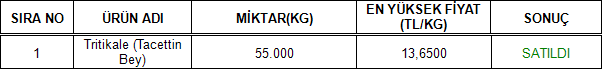 23.06.2025 tarihinde Adana Ticaret Borsamızın Elektronik Satış Salonu’nda gerçekleşen Çukurova Üniversitesi tritikale ihalesinde aşağıdaki sonuç alınmıştır.
