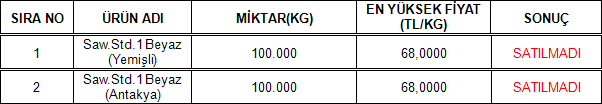 01.10.2025 tarihinde Adana Ticaret Borsamızın Elektronik Satış Salonu’nda gerçekleşen Çukobirlik ihalesinde aşağıdaki sonuçlar alınmıştır.